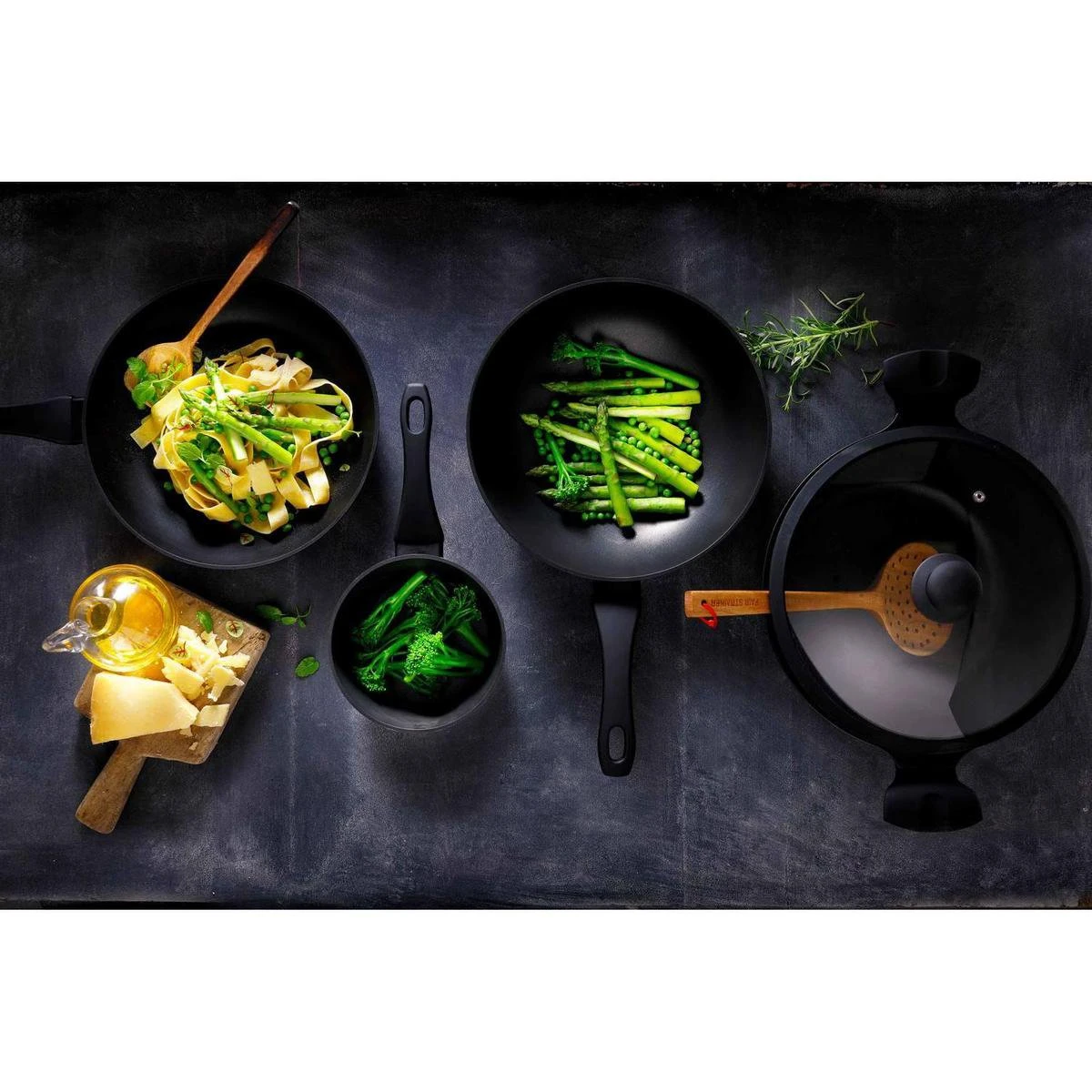 Deze robuuste Vesuvio braadpan van Mammoet Essentials is een echte topper op het gebied van bakken, braden en stomen. Deze pan is gemaakt van aluminium en heeft een anti-aanbaklaag aan de binnenzijde, waardoor etenswaren nooit vast zullen kleven aan de pan. De grote glazen deksel is voorzien van een stoomgat, waardoor overtollige warmte kan ontsnappen. De softtouch knop en handvatten zorgen ervoor dat de pan en deksel stevig in hand liggen. Bovendien is deze pan te gebruiken op iedere warmtebron, zelfs inductie. Aangeraden wordt om deze pan te wassen met heet water en een afwasborstel. De diameter van deze pan is 28 cm.